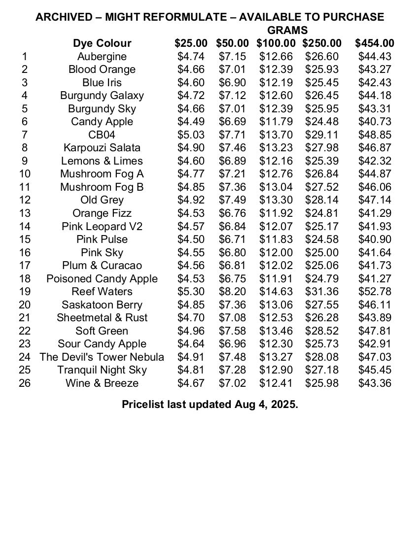 All of the colours I have ever made, but are not at present active on the website are on this list. They are available for order, no inventory is on hand, recipes will be made to order.